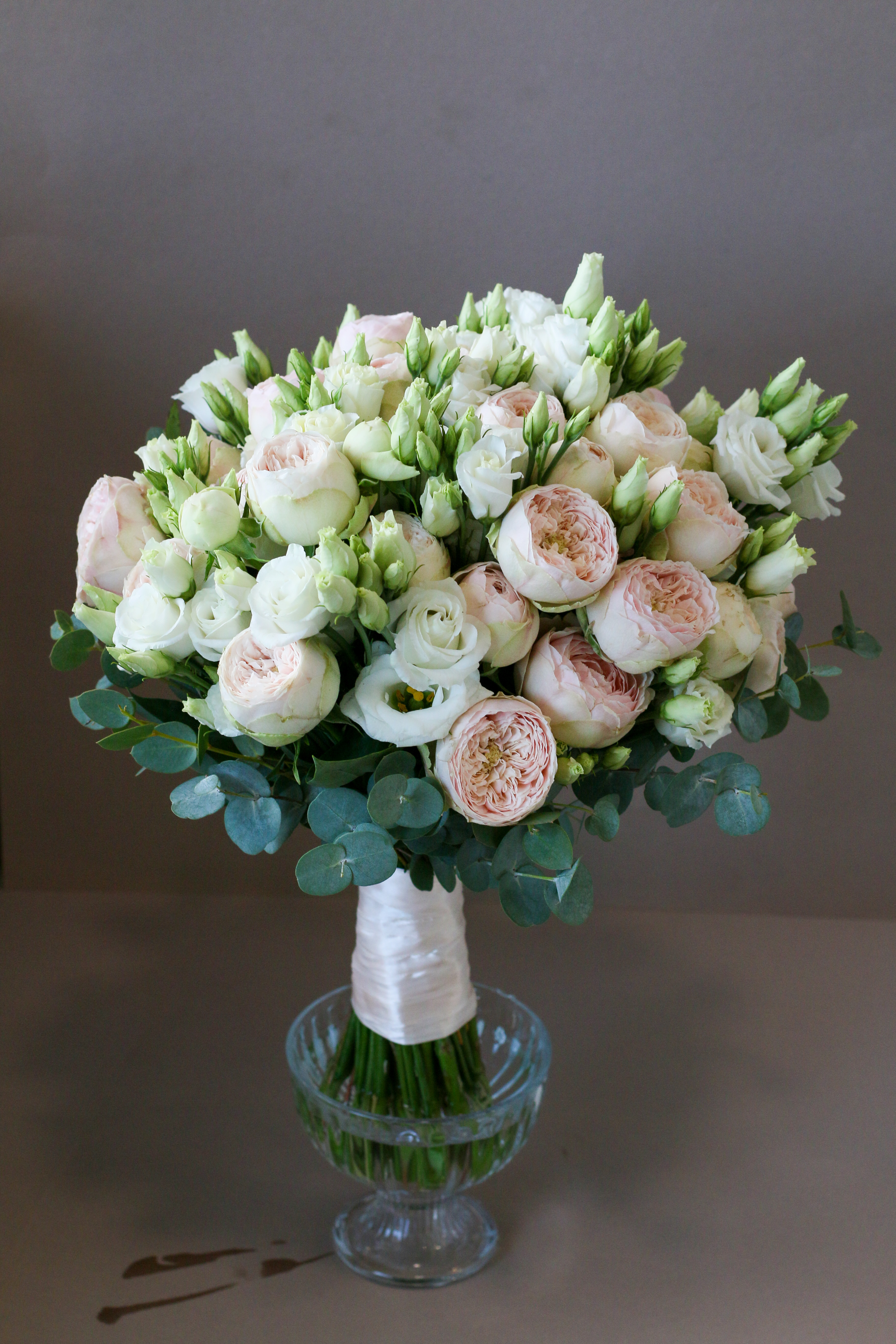 Нежный свадебный букет из пионовидных роз и эустомы добавит изящные нотки к образу любой невесты.