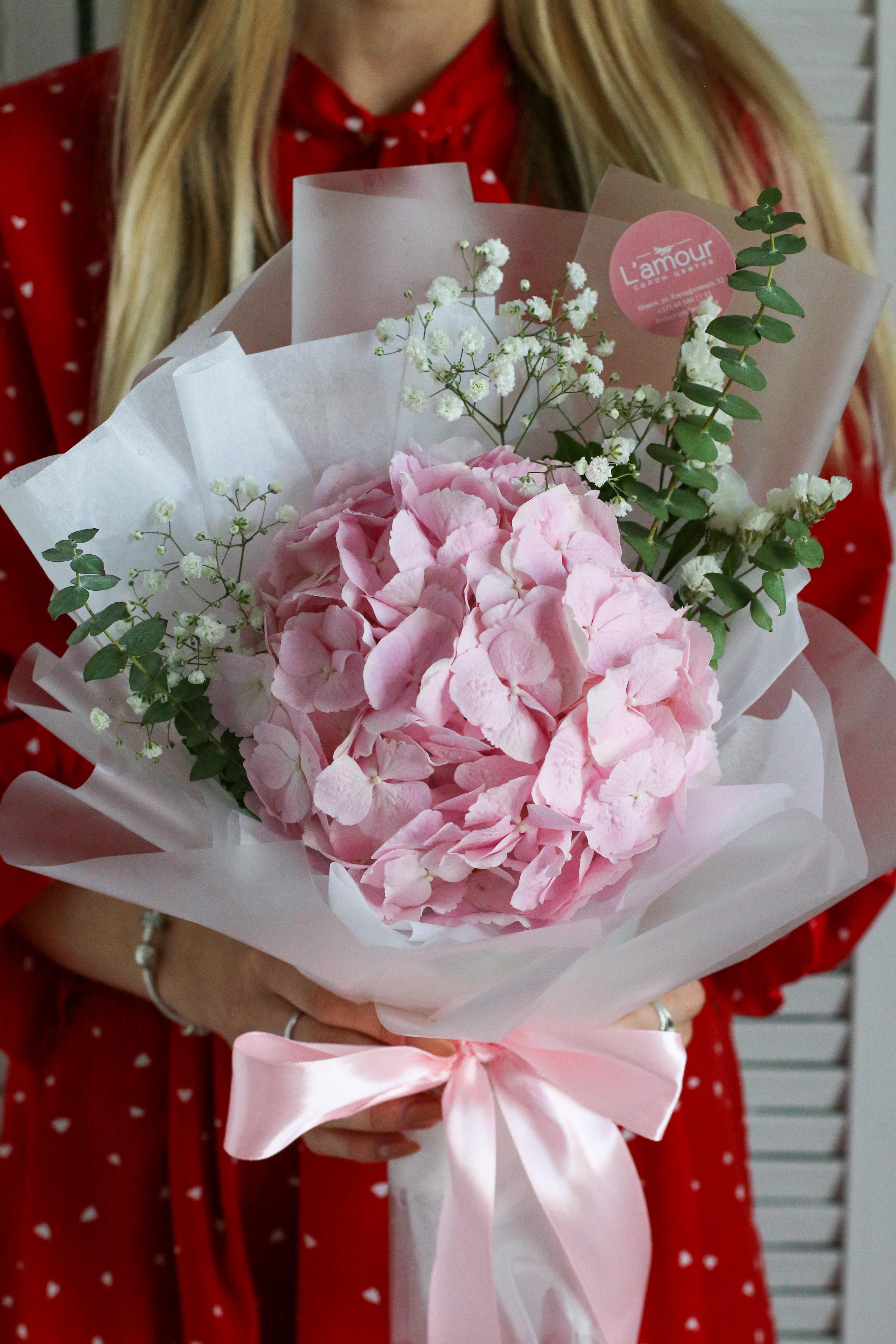 Воздушная гортензия в обрамлении гипсофилы и эвкалипта- хороший выбор для поднятия настроения.