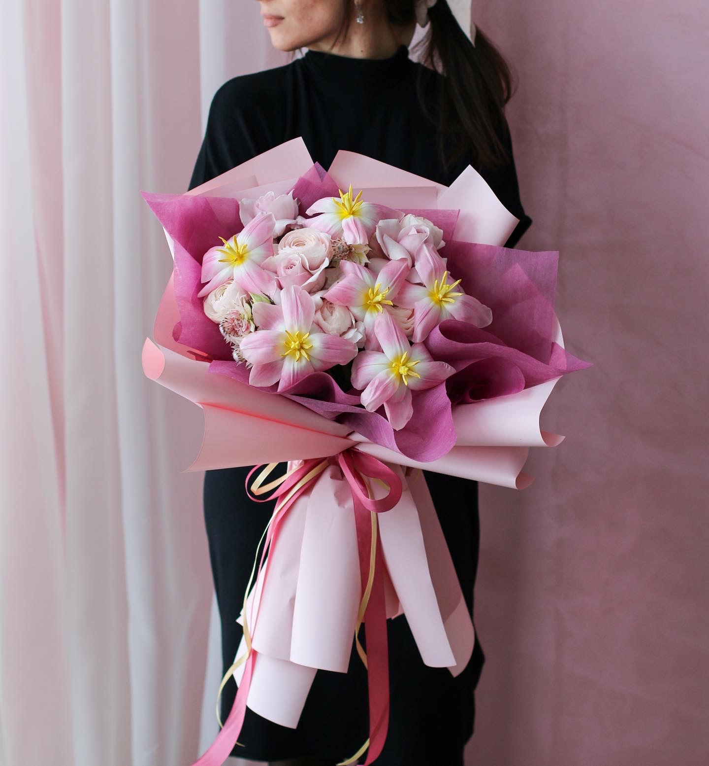 Нежнейший букет с тюльпанами и сортовыми лютиками непременно вызовет улыбку и подарит хорошее настроение вашим близким