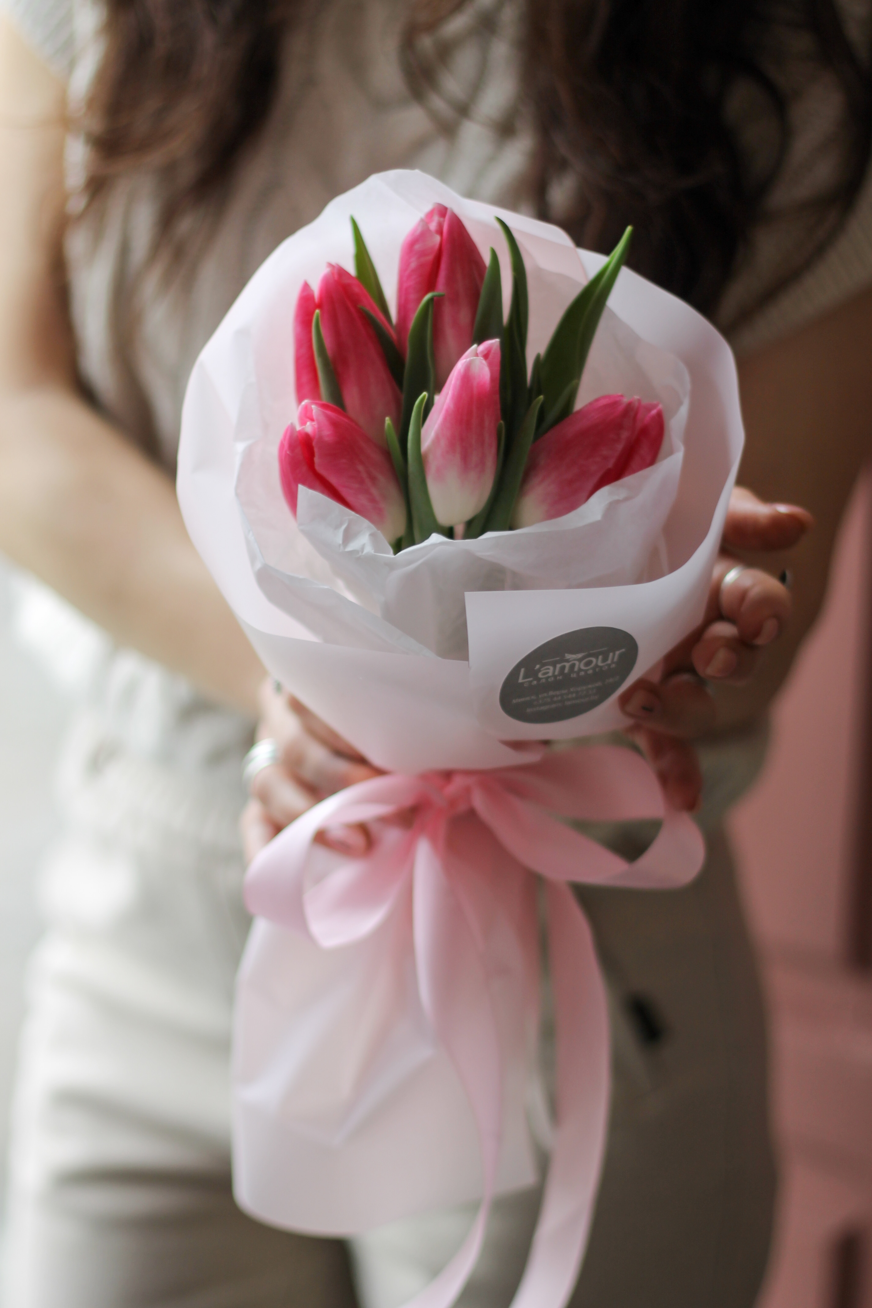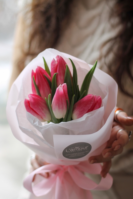 Нежнейший букет-комплимент из 5 тюльпанов в фирменной упаковке станет отличным дополнением к подарку или просто поводом для улыбки близкого человека.