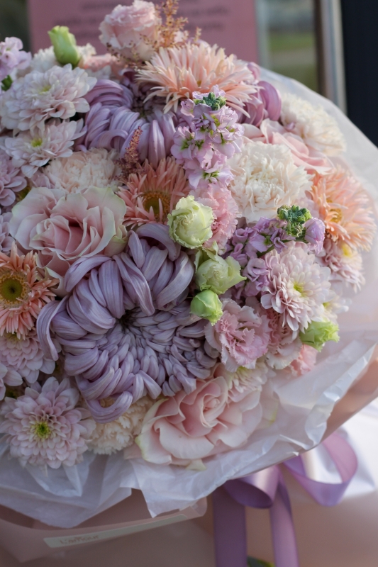 Превосходный букет с французской розой и сортовой хризантемой сорта Виена непременно вызовет море положительных эмоций