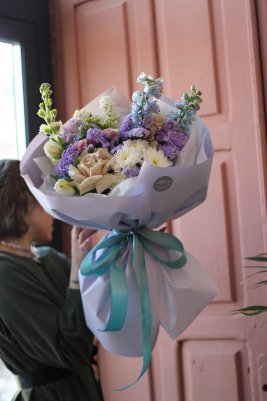 Очаровательный букет с добавлением оксипеталума, дельфиниума и статицы