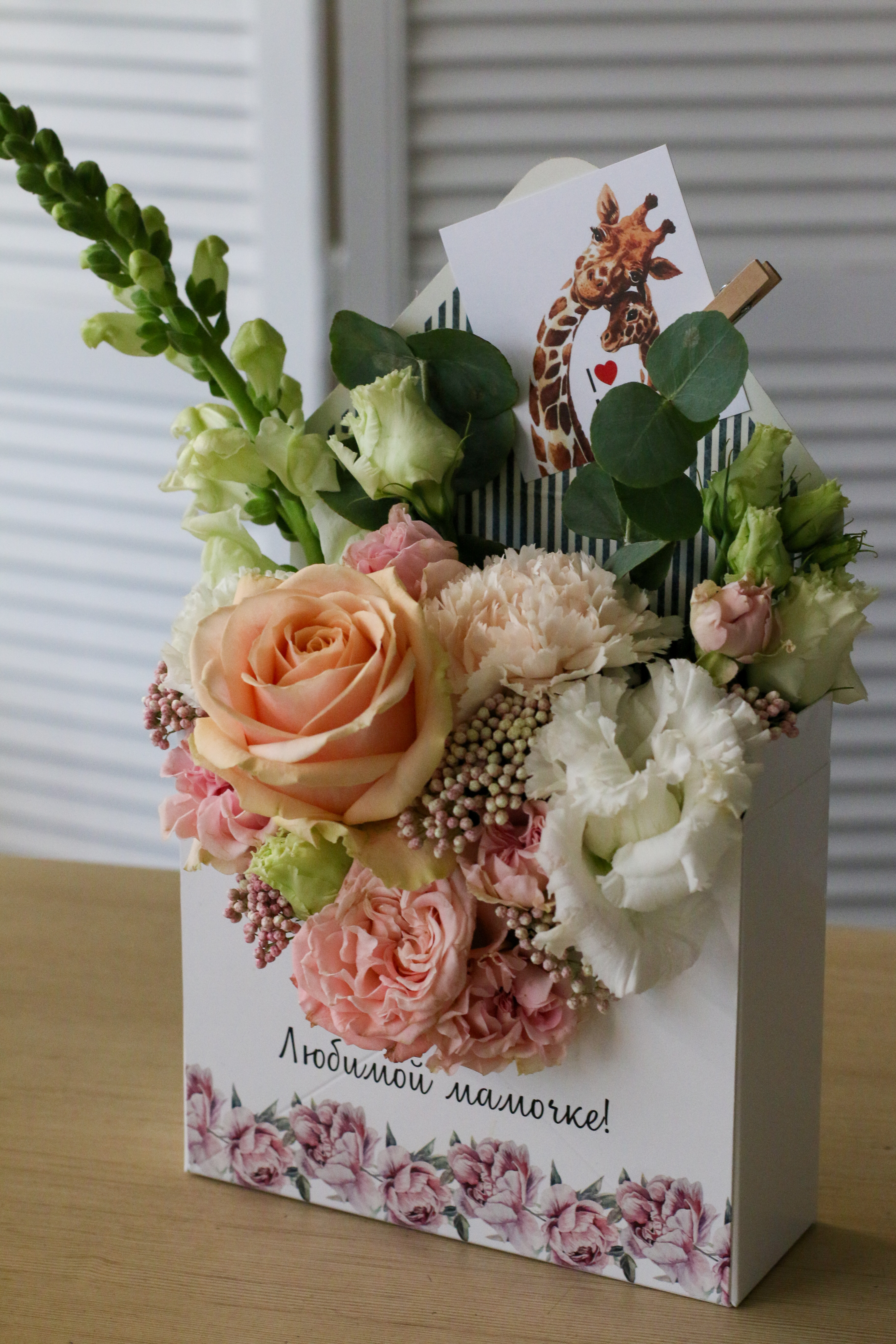 Аккуратный цветочный конверт с ароматной матиолой, розой и озотамнусом несомненно станет поводом для улыбки ваших близких.