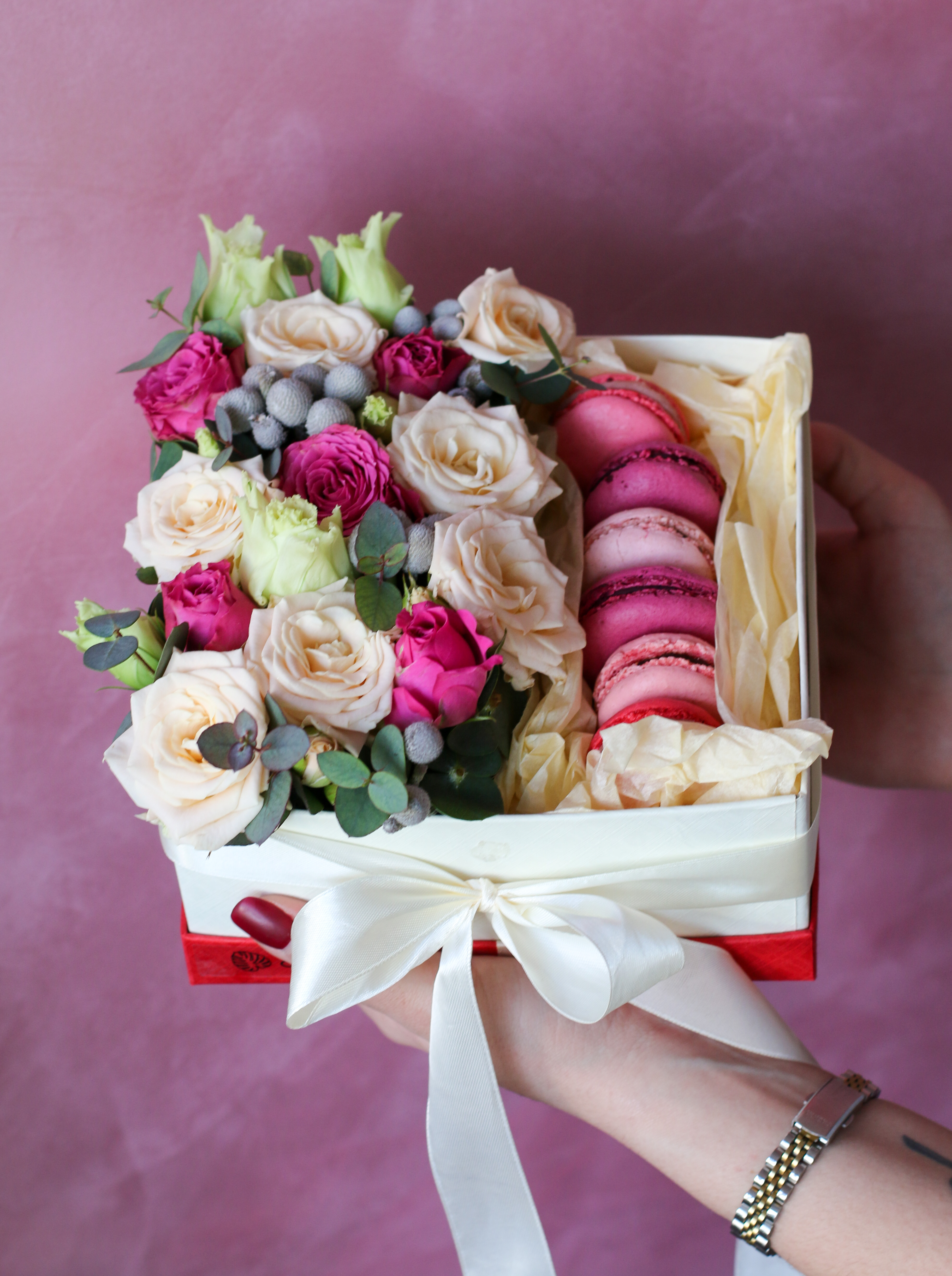 Цветочная композиция с кустовой розой и шишками брунии, дополненная французскими пирожными, станет хорошим выбором для комплимента любимым и родным.