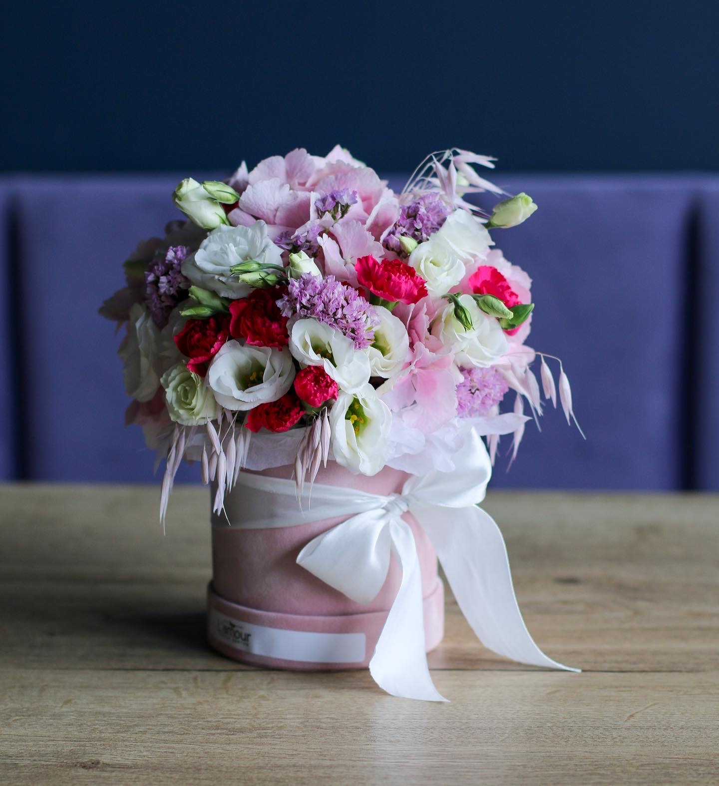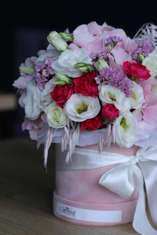 Изящная цветочная композиция в шляпной коробке с эустомой, нежной гортензией, статицей и гвоздикой станет хорошим поводом, чтобы порадовать близких.