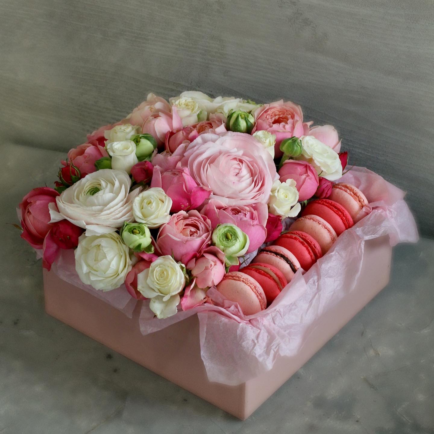 Что может быть лучше цветочной композиции с сортовыми лютиками? Только Цветочная композиция подслащённая французскими пирожными макарунами! Такой комплимент непременно поднимет настроение даже самым искушённым